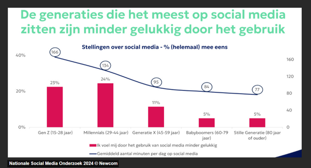 “Jaar op jaar gebruiken wij meer social media en ook intensiever. Maar we worden er niet altijd even gelukkig van. Er is een sterk verband tussen de mate waarin men social media intensief gebruikt en men er minder gelukkig van wordt. Juist de jongere generaties (Gen-Z en Millennials) besteden er veel tijd aan, maar zijn relatief ook degene die er minder gelukkig van worden”, aldus Newcom.